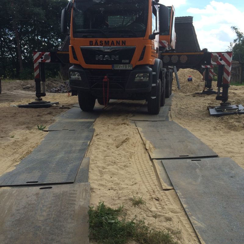 Wir bieten Baggermatratzen-matten, Abstützplatten etc. zur Miete, transportieren sie bis zu ihrer Baustelle und bauen sie vor Ort auf.