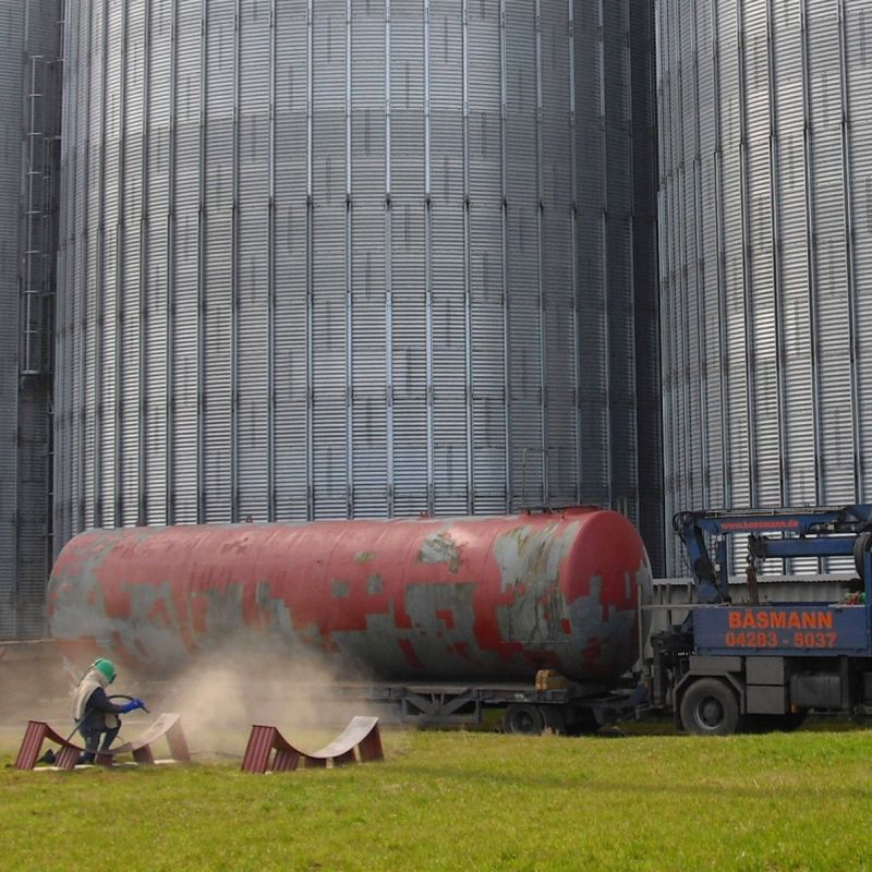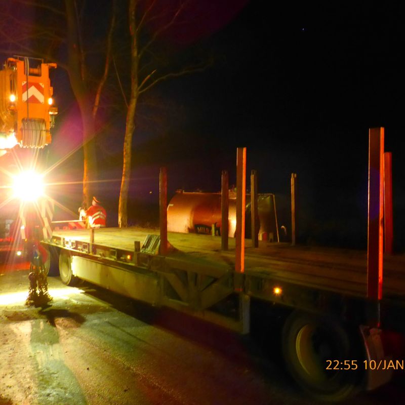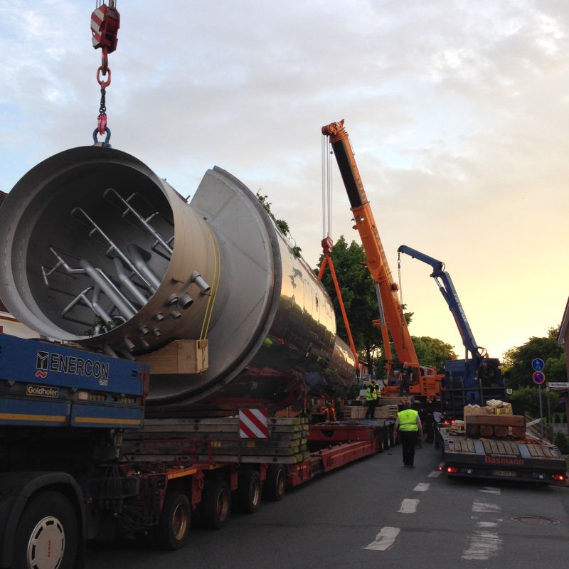 Ein eingespieltes Team und das richtige Equipment sind Voraussetzung für den Transport von großen Tanks und Maschinen. Enge Hallen und das Einsetzen von Maschinen durch Dachöffnungen für die Bäsmann-Spezialisten kein Hindernis, nur Herausforderung.