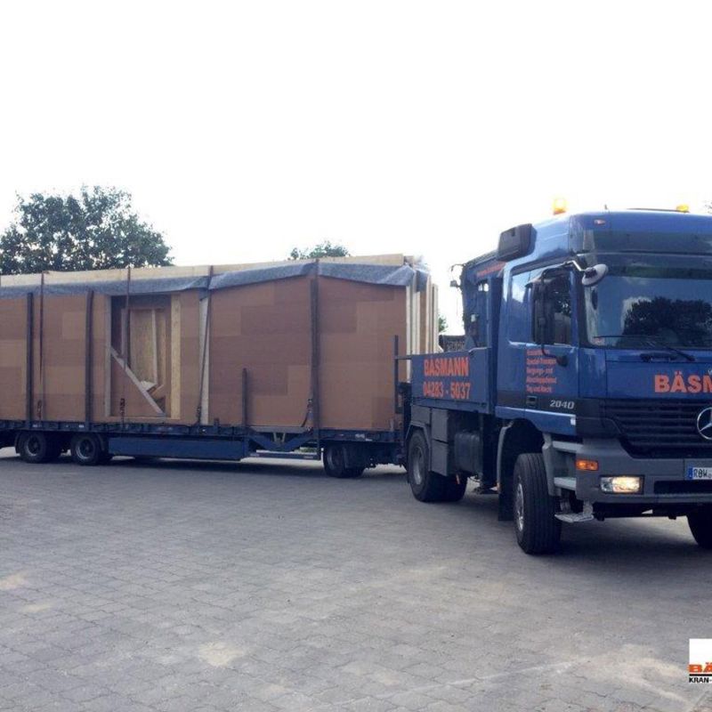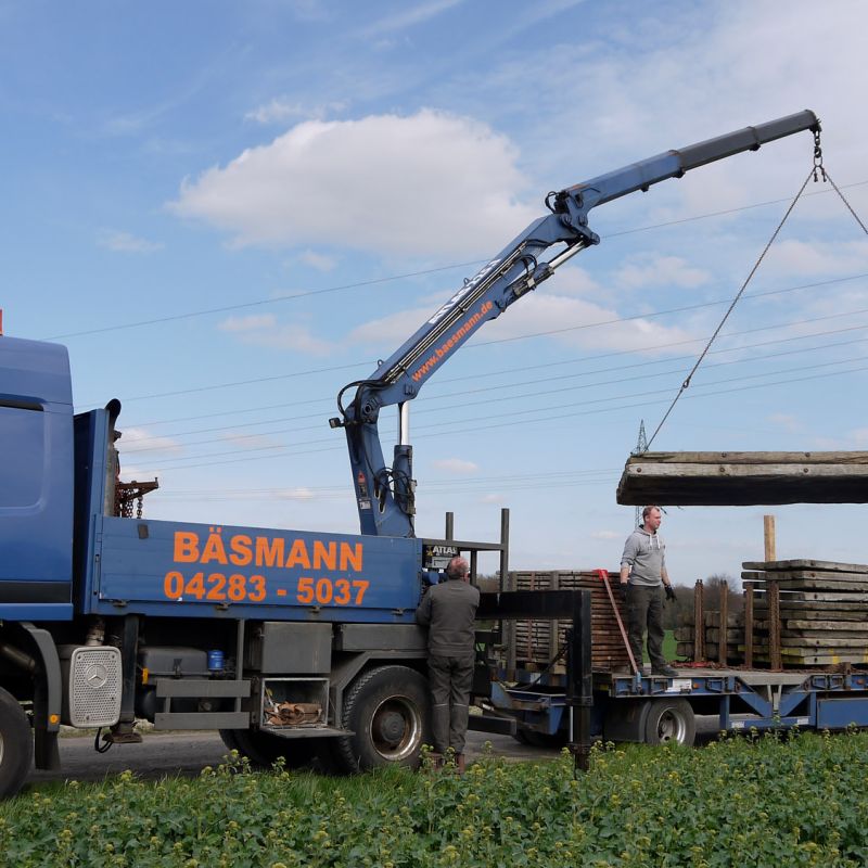 Bei komplizierten Transportaufgaben rückt das Bäsmann-Team mit eigenem Tieflader sowie Zugmaschine mit Ladekran für fach- und termingerechte Erledigung an. Und am Zielort hilft bei Bedarf ein Autokran.